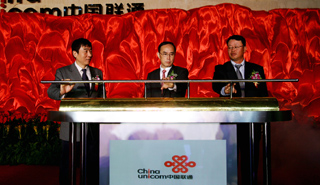 10月15日,工业和信息化部副部长奚国华(左)、中国联合网络通信有限公司筹备组组长常小兵(中)和国务院国有资产监督管理委员会副主任孟建民在揭幕仪式上。