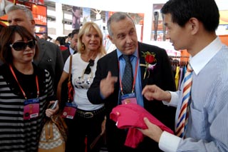 10月21日,中国义乌浪莎企业的营销人员正在向意大利商人推荐新产品。