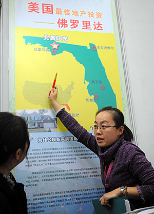 10月30日,一名工作人员在向购房者介绍位于美国佛罗里达的房产项目。