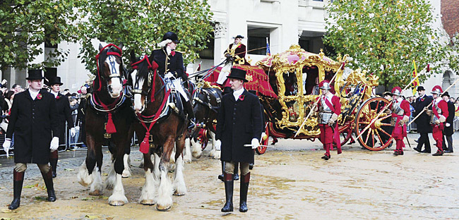 8日,在英国首都伦敦,新当选的金融城市长的金马车在巡游。当天,一年一度的金融城市长就职巡游在伦敦举行。伦敦金融城的“市长就职巡游”有800多年的历史,最早是伦敦民选市长就职后从伦敦城巡游到威斯敏斯特向君主宣誓效忠的一项活动,后来演变成伦敦市民的年度狂欢盛会。