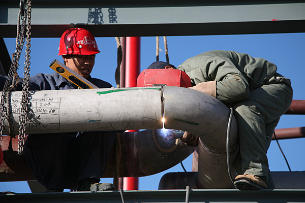 来自吉林省相关部门的数据显示,中国石化今年三大重点项目之一的松南气田一期工程已实现每天向吉林省长春、吉林、四平、公主岭等城市平稳输送天然气30万立方米,这些城市今冬居民和工业供气紧张局面初步得到缓解。图为施工人员在安装设备。