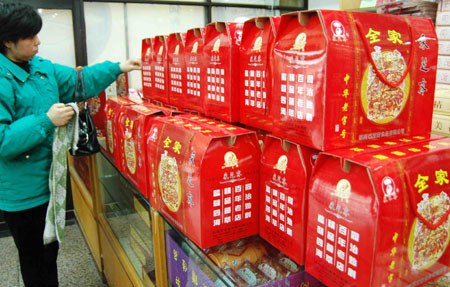 1月7日,一名顾客在选购苏州百年老店采芝斋推出的贺岁礼盒。