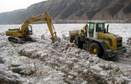 1月19日,抢险人员驾驶挖掘机、推土机在黄河瀑布景区冰凌覆盖的旅游公路上进行破冰作业。