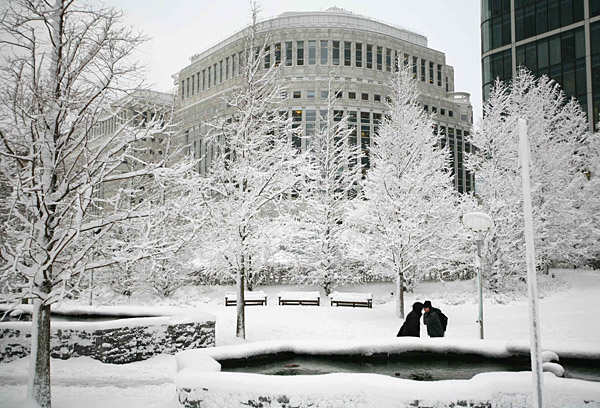 2日,行人经过位于英国首都伦敦的汤姆森路透大楼。当日,大雪造成伦敦市所有公共汽车和部分火车停运,机场也被迫关闭。新华社/路透