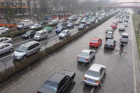 2月18日晨,由于自来水主管道输水联络线爆裂,陕西省西安市南二环长安大学路段汪洋一片,造成交通拥堵。自来水公司管网抢修人员快速赶到现场进行抢修,该路段交通于上午9时左右恢复正常。图为车辆在西安市南二环长安大学附近路段涉水前行。