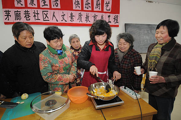 3月4日,杭州茅廊巷社区的居民们正在学习柚子茶的制作。该社区推出多种兴趣课程,居民只要凭着社区免费发放的“终身教育券”就可以来听课学习。