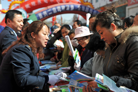 3月29日,税务人员(左)在银川市街头宣传讲解税收政策。 当日,宁夏第18个全国税收宣传月活动在银川正式启动。活动月期间,宁夏税务系统将通过税法进校园、进社区,举办税收知识竞赛,表彰高信用等级纳税人等活动,宣传税收在经济、社会发展中的地位,增强社会各界对税收工作的理解和支持。
