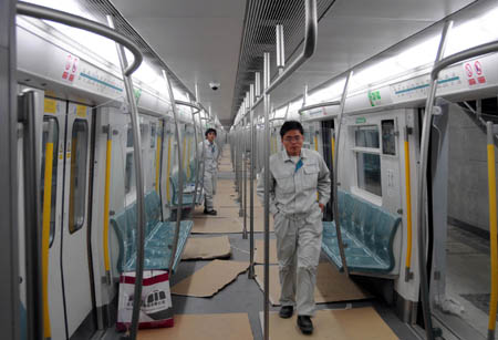 地铁4号线列车车厢。北京地铁4号线列车正在进行运行测试。作为2009年北京开通的惟一一条地铁线路,北京地铁4号线预计将于6月20日开始试运行。目前各站正处在装修阶段,预计5月底将完成。车辆信号与站台屏蔽门和列车车门之间的调试已经基本完成。9月底正式开通运营后,最小行车间隔可达到3分钟,2010年将缩小到2分钟。