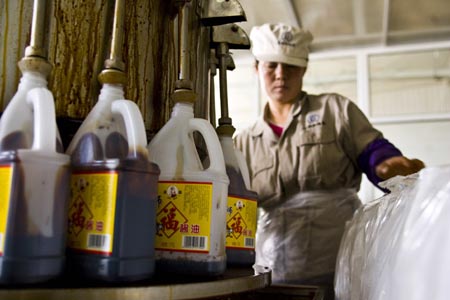 内蒙古鄂尔多斯市是我国重要的沙棘产地,沙棘保存面积达300多万亩,占全国沙棘总面积的70%,被誉为“中国沙棘之都”。随着多家大型沙棘加工企业落户鄂尔多斯东胜区的沙棘产业园生产食醋、酱油、饲料等产品,“沙棘产业链”使沙棘种植在发挥生态效益的同时也产生出很大的经济效益。每年四季,当地农民可以从沙棘种植、管理、收获等环节增加收入。图为工人在内蒙古鄂尔多斯市东胜区天骄沙棘食品有限公司酱油灌装的车间工作。