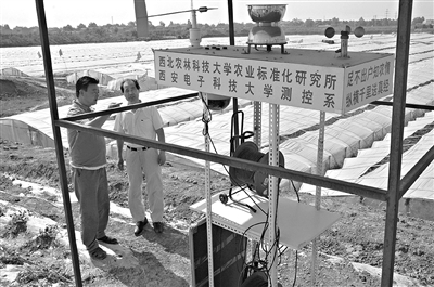 6月5日李鑫教授在室内通过电脑指导瓜农生产。陕西杨凌区大寨乡官村天和园果蔬专业合作社的瓜农们通过一种“电脑远程遥控”系统种植出来的西瓜,不仅瓤脆、甜度大、水分多,而且价格也高出市场的2到3倍。这种由西北农业科技大学李鑫教授和西安电子科技大学共同完成的“电脑远程遥控”系统,不但可以“遥控”生产,还参与销售,食品安全透明度大大增强。
