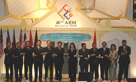 15日,在泰国曼谷,中国商务部长陈德铭(左六)与东盟10国经贸部长和东盟秘书长素林(右一)合影。当日,第八次中国-东盟经贸部长会议在曼谷举行。中国和东盟签署了中国-东盟自由贸易区《投资协议》。这标志着双方成功地完成了中国-东盟自贸区协议的主要谈判,中国-东盟自贸区将于2010年如期全面建成。