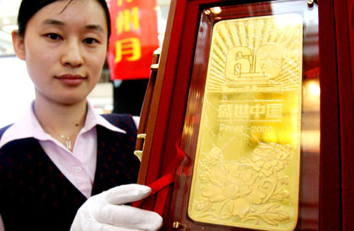 图为一名工作人员展示重达10000克的“盛世中国”纪念金条。