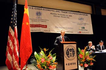 14日,美国商务部副部长助理蔡瑞德在会上发表讲话。当日,美中经贸投资合作论坛在美国芝加哥举行,中国贸促会副会长于平率领由167名企业家组成的中国企业家代表团参加了本次论坛。与会人士一致呼吁在尚未完全克服经济危机的形势下,中美两国需进一步加强经贸合作,为世界经济的复苏做贡献。新华社记者胡光耀摄