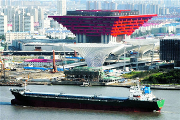 图为正在施工的上海世博园区永久性标志建筑———世博轴和中国馆(红色)。 近日,上海世博园区建设正紧张进行,五大永久性标志建筑“一轴四馆”(世博轴、中国馆、主题馆、演艺中心、世博中心)已全部封顶,进入内部装修施工阶段。 新华社发