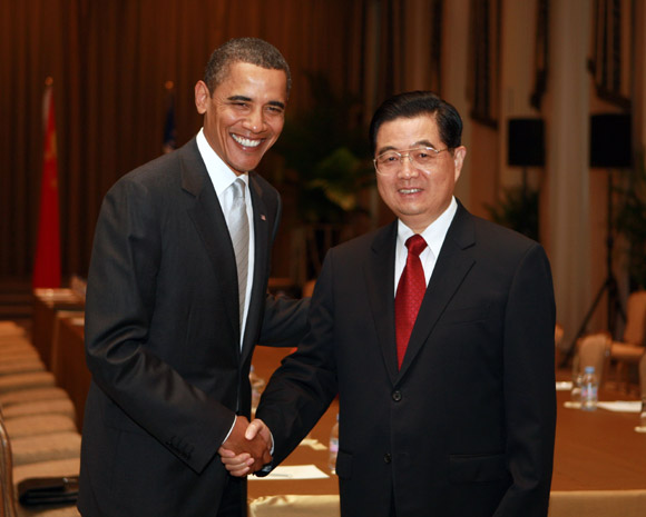 图为9月22日,国家主席胡锦涛在纽约同美国总统奥巴马举行会晤。 胡锦涛表示,美方对中国输美轮胎采取特保措施不符合两国利益,类似事情不应该再次发生。在当前经济金融形势下,中美双方更应该坚定反对贸易和投资保护主义。