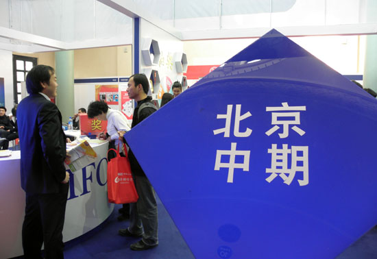 11月5日拍摄的第五届北京国际金融博览会北京中期期货公司展台。当日,为期4天的第五届北京国际金融博览会在北京展览馆开幕。本届金博会吸引了银行、证券和基金公司、保险公司等百余家机构参展。
