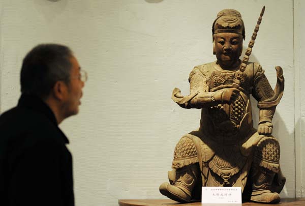 从12月5日开始,长沙首届民间收藏精品展在长沙市博物馆展出。35位民间收藏家的1000余件收藏品通过9个展厅、18个专题展区来展出,展品包括金银器、青铜器、陶器、玉石器、漆木器、书画、家具、古籍拓本等,年代跨度从商代至近现代,其中不少民间珍宝是首次与观众见面,令参观者大开眼界。图为一位参观者在参观明朝“木雕武财神”。