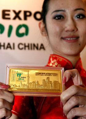 1月19日,模特在展示上海世博会彩色纪念金条。 当日,经上海世博会事务协调局授权,由中国金币总公司发行、上海金币投资有限公司总经销的中国2010年上海世博会彩色纪念金条(第2组)及彩色纪念银条系列产品在上海正式发布。
