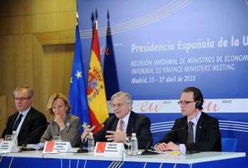 在4月召开的欧盟财长非正式会议上,有关各方曾就开征银行税等问题协调欧盟内部立场。图为当时欧洲央行行长特里谢(右二)出席欧盟财长非正式会议记者招待会。新华社记者 陈海通 摄