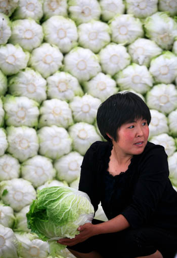 6月3日,在济南市匡山农产品综合交易市场,一位商贩在挑选白菜。 当日,来自济南市最大的农产品集散地——匡山农产品综合交易市场的统计数据显示,由于气温上升和本地菜大量上市,六月初菜价较上月同期下降近五成,白菜、西葫芦等少数蔬菜价格回落更多。受此影响,外省市来济南批发蔬菜的车辆明显减少,农产品日成交量由1500吨下降至1000吨左右,蔬菜批发也进入淡季。