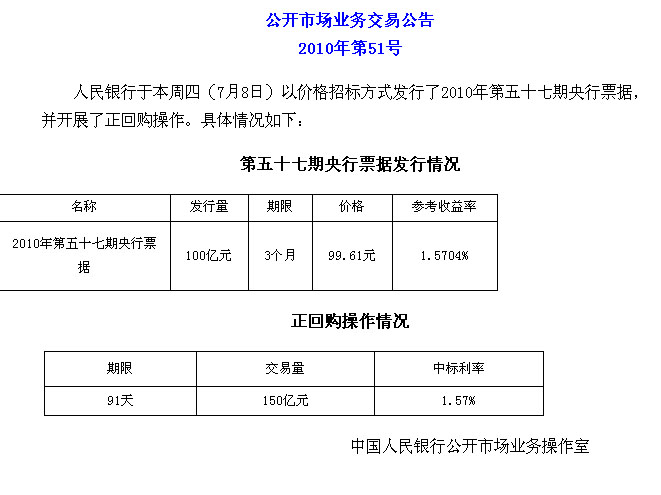 央行发行100亿3个月期央票