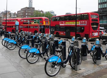 10月2日,在英国首都伦敦,络绎不绝的公交车驶过一个自行车租赁站。 |
