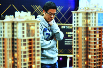 11月21日,市民在福州“住交会”一新开盘楼盘展台前凝思。该楼盘均价为1.9万元/平方米,最高为2.5万元/平方米。新华社记者