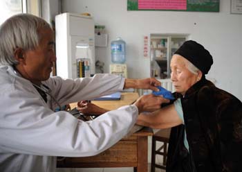 11月29日,一名山东省邹平县廉家村农民在卫生室体检时检测血压。2010年11月开始,山东省邹平县为全县62万农民进行当年的第二次体检工作全面展开。记者 徐速绘/摄 |