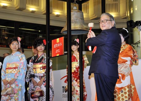 1月4日,在日本东京证券交易所举行的新年开市“大发会”上,日本邮政改革和金融事务担当大臣自见庄三郎(右前)敲响开市钟。 东京证券交易所当日举行“大发会”新年开市仪式。受美股上扬及日元走跌的影响,4日东京股市早盘日经225种股票平均价格指数报10373.85点,上涨144.93点,涨幅为1.42%。