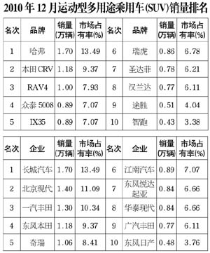 2010年12月运动型多用途乘用车(SUV)销售12.62万辆,环比下降4.93%,同比增长59.01%;12月销量排名前10位的SUV品牌共销售9.02万辆,占SUV销售总量的72%。