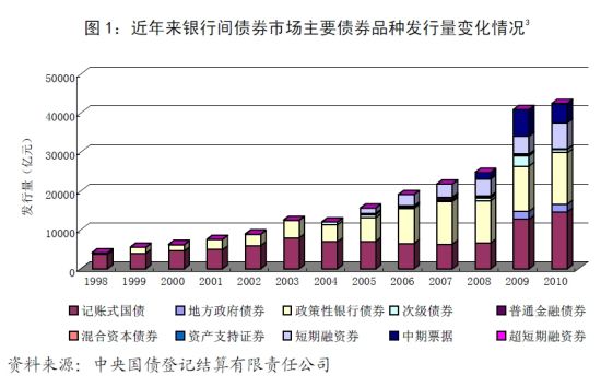 2010年,财政部通过银行间债券市场发行债券1.7万亿元(包括代发地方政府债券2000亿元);国家开发银行、中国进出口银行、中国农业发展银行在银行间债券市场发行债券1.3万亿元;汇金公司在银行间债券市场公开发行债券1090亿元;金融债券发行主体范围进一步扩大,外资法人银行获准发行金融债券,三菱东京日联银行(中国)在银行间债券市场公开发行金融债券10亿元;积极拓宽金融租赁公司和汽车金融公司资金来源渠道,3家金融租赁公司和1家汽车金融公司总计发行金融债券50亿元。公司信用债券继续发展,2010年债券市场共发行公司信用债券1.6万亿元,其中发行短期融资券6742亿元、中期票据4924亿元、中小非金融企业集合票据46.6亿元、企业债券3627亿元、公司债券511.5亿元,同时为提高企业流动性管理能力,创新推出超短期融资券,已成功发行150亿元。