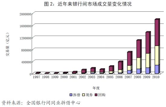 一是成交量继续大幅增加。2010年,银行间市场成交量近180万亿元,同比增长31.1%。其中,现券成交64万亿元,同比增长35.5%;拆借成交27.9万亿元,同比增长44%;质押式回购与买断式回购成交87.6万亿元,同比增长24.6%。