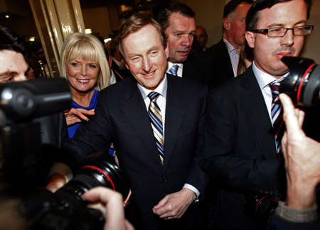 26日,爱尔兰反对党统一党领袖恩达·肯尼(中)在都柏林出席支持者集会。恩达·肯尼说,他所领导的政党已获得议会众议院选举的胜利。他执政后将尽快就爱尔兰援助方案举行谈判,以调整部分条款,减轻爱尔兰的负担。 债务危机爆发后,爱尔兰接受欧洲联盟和国际货币基金组织850亿欧元援助方案,被迫实施大幅度削减赤字措施。援助贷款年均利率为5.8%。这一方案引发公众强烈不满。