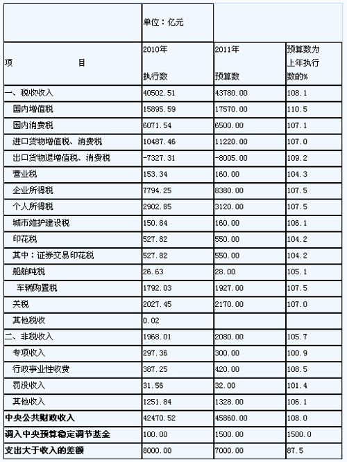 2011年中央公共财政收入预算表
