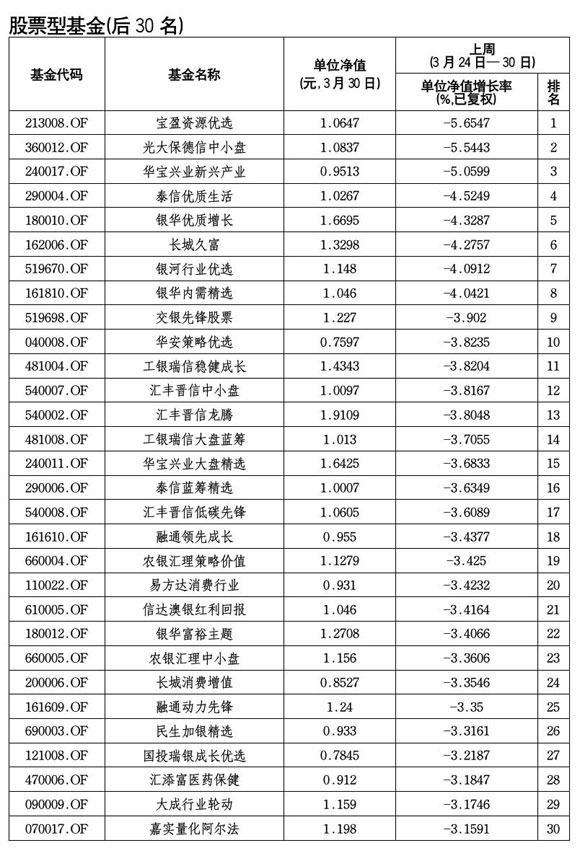 宝盈资源优选"荣登"本周最差收益股票型基金榜首。 宝盈基金管理有限公司旗下,以投资具有资源优势的股票为主的股票型基金——宝盈资源优选以-5.65%的单位净值增长率成为3月24日-30日期间收益最差的股票型基金。