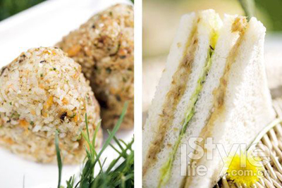 野餐的风格很多,时下最流行的是低碳环保路线,可以自己在家做一些简单容易携带的食物,油炸、烘焙、凉拌的食物更加适合保存。比如三明治、寿司、沙拉、饭团——彼得·梅尔曾经说:美味的三明治是成功野餐的一半。而饭团,更是日本人野餐的最爱,在樱花盛开的季节,几乎所有在樱花树下铺开一张漂亮花布的赏樱者,都会带上手工制作的美味饭团。除了食物的烹饪方式,食材的选择也很重要,就拿寿司来说,鱼生类寿司很容易因为时间和温度的原因变质,而熟食做的寿司就可以保留得更好。朋友聚会的话,不妨规定每个人带一个菜,互相分享。