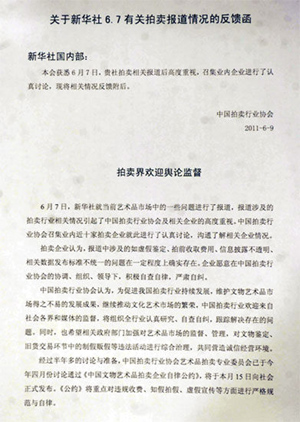 针对近期广大网民、收藏爱好者和艺术界人士反映艺术品拍卖市场存在虚假鉴定、虚报成交额、联手做局等不法行为的问题,中国拍卖行业协会9日召集“保利”“嘉德”“翰海”“匡时”等多家涉事拍卖企业就此进行沟通讨论,认为报道中涉及“虚假鉴定”“拍前收取费用”“信息披露不透明”“相关数据发布标准不统一”等问题在一定程度上确实存在,中拍协将组织全行业开展自查自纠。 新华社“中国网事”栏目7日播发《网民发帖质疑艺术品拍卖“天价”有猫腻