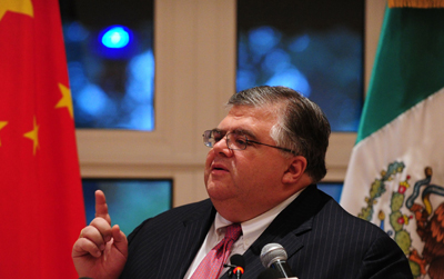 墨西哥央行行长阿古斯丁·卡斯滕斯16日在北京同中国官员就其竞选IMF总裁一事举行了会谈。从目前形势看,卡斯滕斯的竞争前景不容乐观。他的支持力量主要来自拉丁美洲,除本国墨西哥外,还包括哥伦比亚、委内瑞拉、玻利维亚、秘鲁等国,总共10多个国家。而他的竞争对手拉加德在欧洲广受支持,美国和俄罗斯虽然没有公开表态,但其官员言谈间流露出倾向拉加德的意味。不过,卡斯滕斯表示,他仍会坚持竞争,“就像他们谈及棒球比赛,比赛没结束就不算完”。图为当天他在墨西哥驻华使馆举行新闻发布会时的情形。