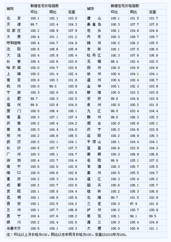 3、2011年5月份,59个城市的新建住宅价格指数根据网签数据计算,其他11个城市根据统计系统房地产开发统计报表中各个项目的分类销售面积和金额数据计算。59个网签数据城市分别是:北京、天津、石家庄、太原、呼和浩特、沈阳、大连、长春、哈尔滨、上海、南京、杭州、宁波、合肥、福州、厦门、南昌、济南、青岛、郑州、武汉、长沙、广州、深圳、南宁、海口、重庆、成都、贵阳、昆明、西安、兰州、西宁、银川、乌鲁木齐、秦皇岛、包头、丹东、吉林、牡丹江、无锡、扬州、徐州、温州、金华、泉州、九江、洛阳、平顶山、宜昌、岳阳、惠州、湛江、韶关、桂林、北海、三亚、泸州、南充。5月份新增加的城市是温州。