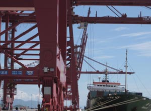 2010年8月26日,韩国集装箱班轮“中海向珠”成功靠泊梅山港区1号泊位,标志着梅山保税港区10条韩国航线正式开通,这也是宁波梅山港区靠泊的首艘集装箱班轮。资料照片 |