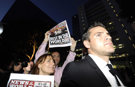 《世界新闻报》可能非法取得犯罪受害人——包括一名被绑架而后被撕票的13岁女童——语音邮件信息的事情被揭露,在英国引起公愤,也让这家报纸陷入危机,外界原以为该报只关注名人和其他声名显赫人物的动向。(路透社)