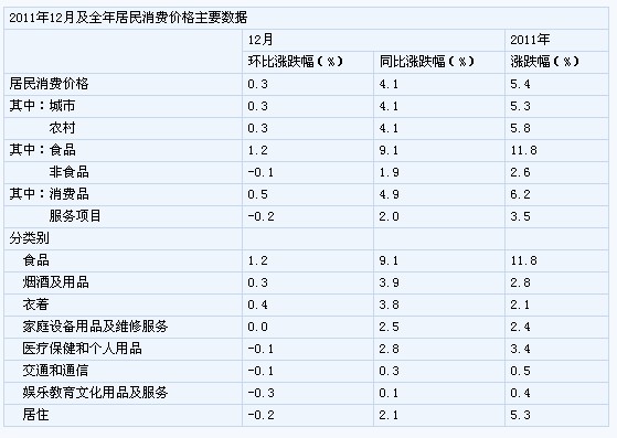 2011年12月份,全国居民消费价格总水平同比上涨4.1%。其中,城市上涨4.1%,农村上涨4.1%;食品价格上涨9.1%,非食品价格上涨1.9%;消费品价格上涨4.9%,服务项目价格上涨2.0%。全国居民消费价格总水平环比上涨0.3%。其中,城市上涨0.3%,农村上涨0.3%;食品价格上涨1.2%,非食品价格下降0.1%;消费品价格上涨0.5%,服务项目价格下降0.2%。2011年,全国居民消费价格总水平比上年上涨5.4%。