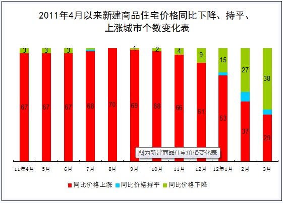 4月18日,国家统计局发布了3月份70个大中城市住宅销售价格数据。数据显示,70个大中城市新建商品住宅销售价格总体上继续呈下降态势。 从同比数据看,3月份,70个大中城市新建商品住宅销售价格同比下降的城市有38个,比2月份增加了11个,是自2011年9月个别城市再次出现价格同比下降以来,下降城市个数最多的月份。