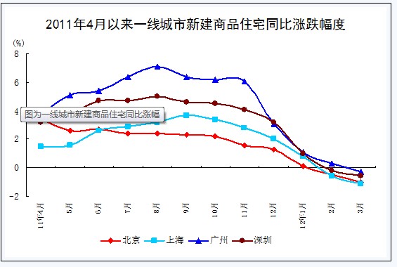 在新建商品住宅销售价格同比下降的38个城市中,有19个城市的降幅比2月份还有所扩大。即使在新建商品住宅销售价格同比上涨的29个城市中,21个城市的同比涨幅也比2月份有所回落。北京、上海、广州、深圳等一线城市新建商品住宅销售价格同比降幅进一步扩大,3月份比2月份分别扩大0.5个、0.5个、0.6个和0.4个百分点。房地产市场宏观调控成效继续显现。