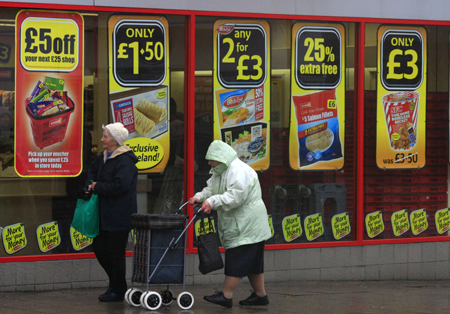 英国国家统计局25日宣布,根据初步统计,英国今年第一季度的国内生产总值萎缩0.2%。这意味着英国经济陷入衰退。去年第四季度,英国经济萎缩0.3%。一般认为,连续两个季度的经济萎缩即意味着一国经济进入技术性衰退。这也表明,自2008年金融危机以来,英国经济再次陷入衰退。今年第一季度,英国制造业产值下降0.4%,建筑业产值大幅下降3%,服务业产值小幅增长0.1%。 图为两位行人从曼彻斯特一家商店大型橱窗上张贴的降价广告前走过。