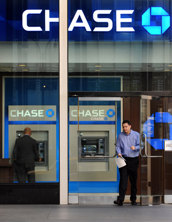 美国最大银行摩根大通5月10日宣布旗下投资部门一项交易组合亏损20亿美元,震惊全球金融界,让英美等国银行监管呼声再次高涨。 图为2010年4月14日,一名男子从美国纽约一家摩根大通银行营业点走出。记者