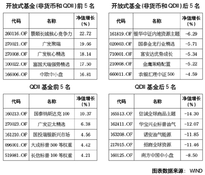 除此之外,64只封闭式基金平均净值增长7.81%;79只货币市场基金平均净值增长2.20%,折算年平均收益率超过4%;21只保本型基金平均净值上涨3.55%;51只QDII平均净值则下跌了1.59%,成为了各类基金产品中为一整体出现下跌的类型。
