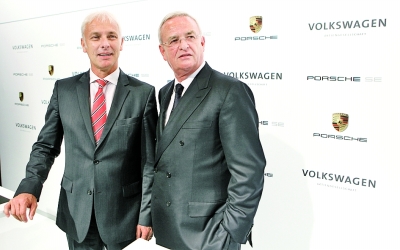 7月5日,德国大众汽车公司首席执行官马丁·温特科恩(右)和保时捷股份公司首席执行官马蒂亚斯·米勒出席在德国沃尔夫斯堡举行的新闻发布会。