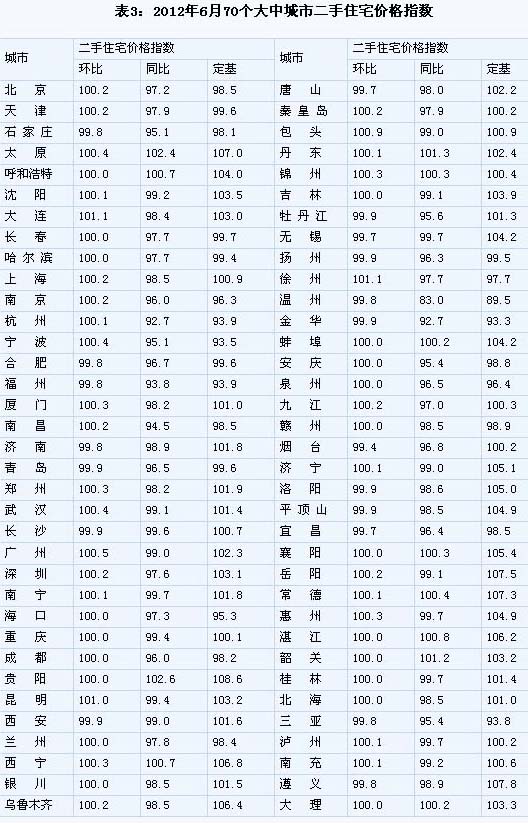 (二)与去年同月相比,70个大中城市中,价格下降的城市有58个,上涨的城市有12个。6月份,同比价格上涨的城市中,涨幅均未超过2.6%,涨幅比5月份回落的城市有8个。