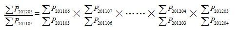 3、同比价格指数的计算方法。由于部分城市用以计算同比价格指数的基期网签数据缺失,故不能计算2012年10月前各月与网签数据同一口径的同比价格指数。为保持同比价格指数计算和发布的连续性和稳定性,满足有关方面的需要,国家统计局采用有关房价统计数据和按网签数据计算的房价数据,根据同比指数和环比指数之间的数学关系,对5月份同比价格指数的计算进行了技术处理:将2011年6—12月的环比数据连乘再乘以今年1—5月的环比数据生成本月同比价格指数。以此类推可计算其他月份的同比价格指数。计算公式表示为:
